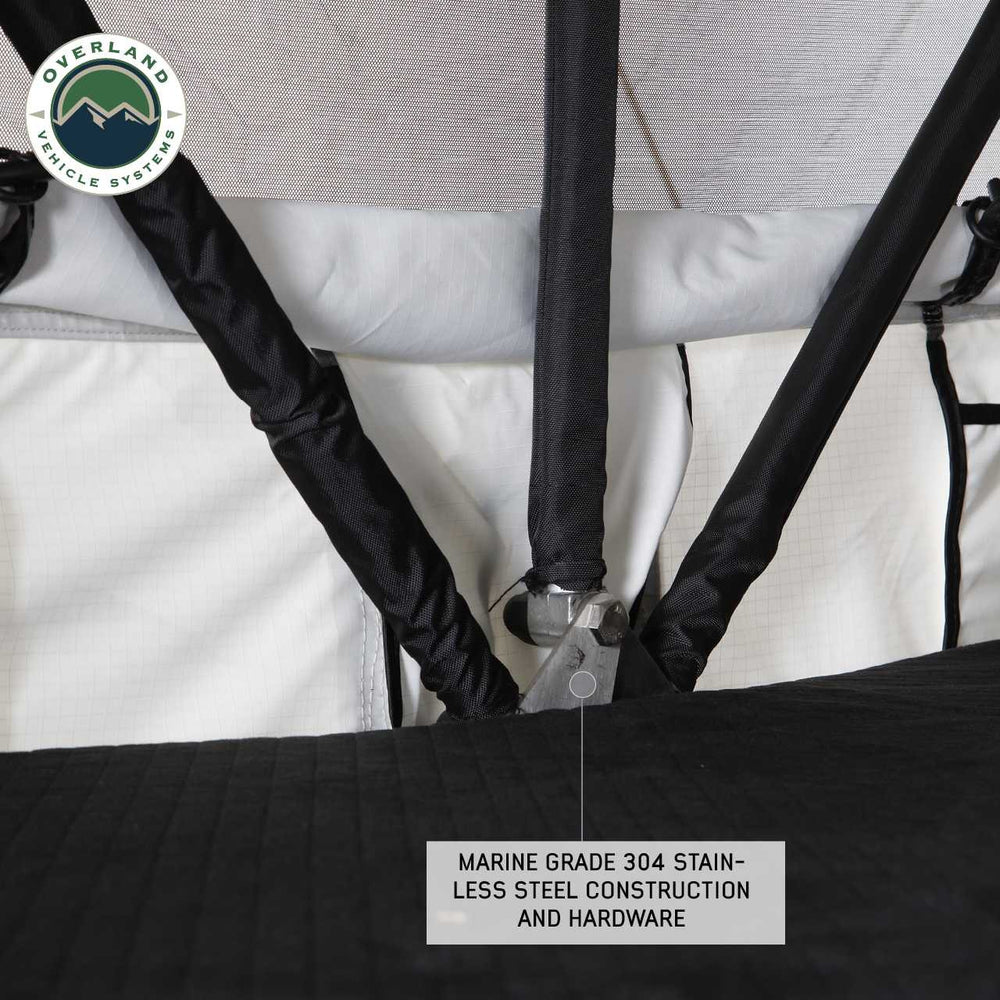 If you're looking for a Roof Top Tent that is built to last, look no further than the Overland Vehicle Systems Nomadic 3 Arctic Extended Roof Top Tent. This Roof Top Tent is made from heavy duty double insulated one-piece black diamond plated base material and features marine grade stainless steel hinges and hardware. The 96" heavy duty aluminum telescoping ladder with locking strap and quick release steel hinges make it easy to get in and out of the roof top tent, even in the harshest of conditions. The 600D Heavy Duty Poly Cotton Rip Stop Canvas body is built to withstand the elements, and the included rain fly provides additional protection from the elements. The 420D Heavy Duty Polyester rainfly will keep you dry in even the heaviest of downpours. All the seams in both Roof Top Tent Rainfly and Roof Top Tent Body are heat sealed for extra waterproofing. The new "V" strength ridges integrated in the window rod poles are designed for stability in windy conditions. So, if you're looking for a roof top tent that can withstand Mother Nature, the Overland Vehicle Systems Nomadic 3 Arctic Extended Roof Top Tent is an excellent choice.