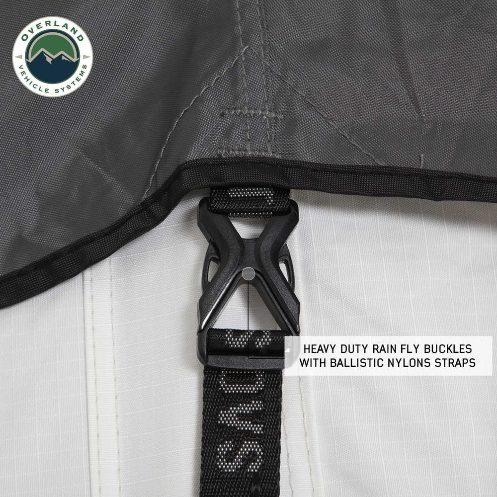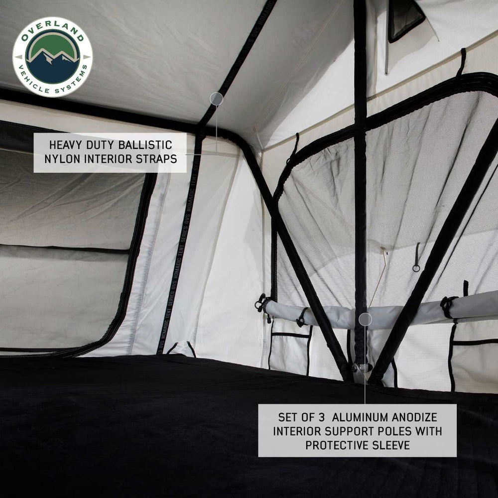 We all know that one of the best parts of any outdoor adventure is coming home to a comfortable bed at the end of the day. But what if you want your home to be a Roof Top Tent for your adventure? That's why we added many functional features in our Overland Vehicle Systems Nomadic 3 Arctic Extended Roof Top Tent. The Nomadic 3 Arctic Extended Roof Top Tent is built tough and can withstand all kinds of weather conditions. The toughness comes with oversized Roof Top Tent Body Poles and integrated "V" Strength Ridges in the Window Rods, both help to improve the performance in windy conditions. All our Heavy Duty Buckles are ergonomic for easier synching of your Roof Top Tent. Plus, it comes with a comfortable 3" mattress on top of an insulated base so you can sleep soundly through the night. Both the Roof Top Tent Rainfly and Roof Top Tent Body have an integrated Skylight. So, whether you're hitting the road in your SUV, Jeep Wrangler, Jeep Gladiator, Truck or Trailer, make sure you bring along the best Roof Top Tent on the market. The Nomadic 3 Arctic Extended Roof Top Tent will make all the difference on your next outing. We know you'll appreciate the easy to install, deploy, stow, 4 season weather protection, and functional design that makes this the best Roof Top Tents.